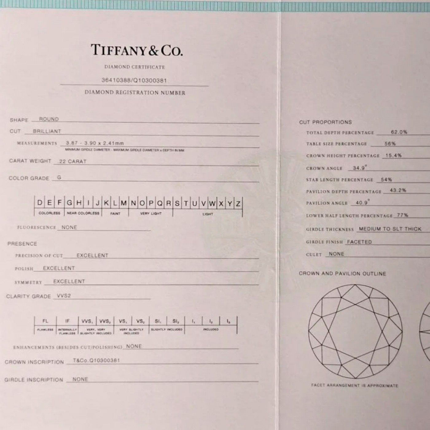 Полный комплект коробок и документов с сертификатом на бриллиант и оригинальным пакетом бренда Тиффани.